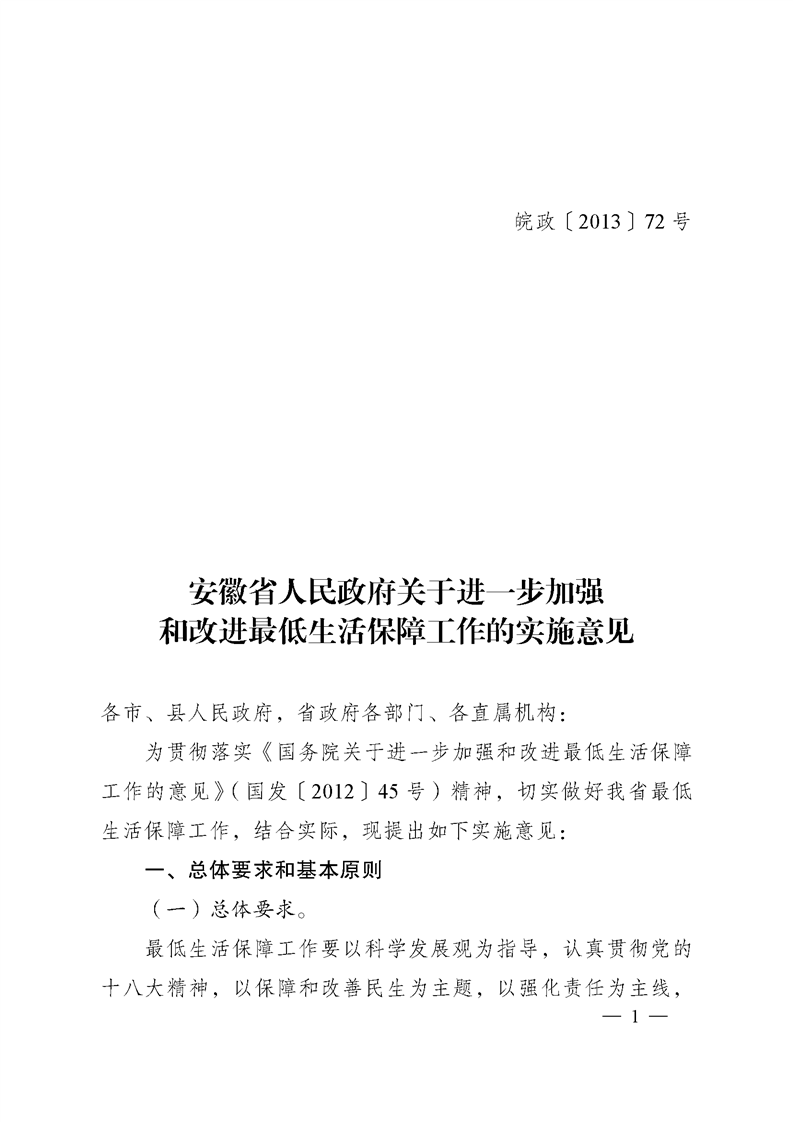 《安徽省人民政府关于进一步加强和改进最低生活保障工作的实施意见》(皖政〔2013〕72号)