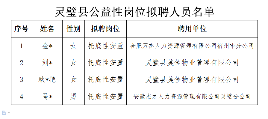 根据《灵璧县就业困难人员公益性岗位招聘公告》和皖人社发〔2020〕4号规定,现对拟聘公益性岗位人员予以公示(名单附后),欢迎社会各界监督。