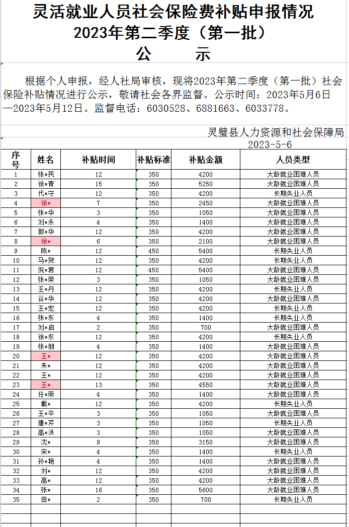 灵璧县灵活就业人员社会保险费补贴申报情况2023年第二季度(第一批)公示
