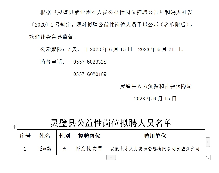 灵璧县2023年6月份公益性岗位拟聘人员公示