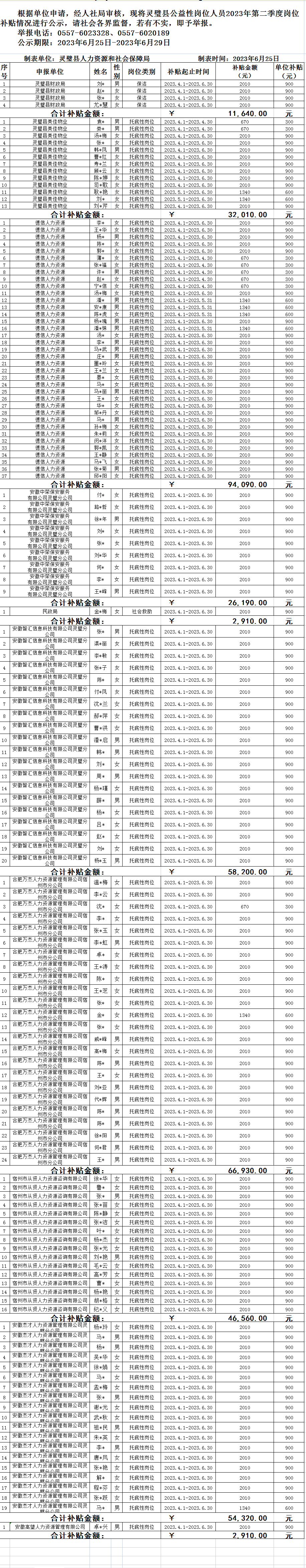灵璧县2023年第二季度公益岗岗位补贴公示