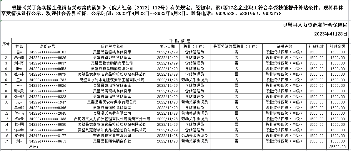 关于雷*等17名企业职工享受个人技能提升补贴的公示
