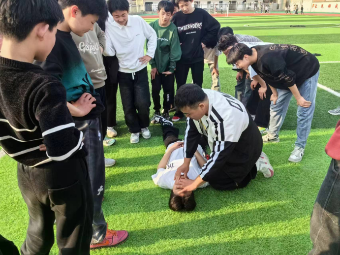 体育课上,全校学生700余人分班级、分批次的接受了培训。在向学生传授心肺复苏技能、创伤包扎等救急知识及技能过程中,沙老师生动的讲解和示范了吸引了同学们的兴趣,博得了同学们的阵阵掌声,直观的教学演示为学生遇到突发危险展开自救和互救提供了专业知识保障。同