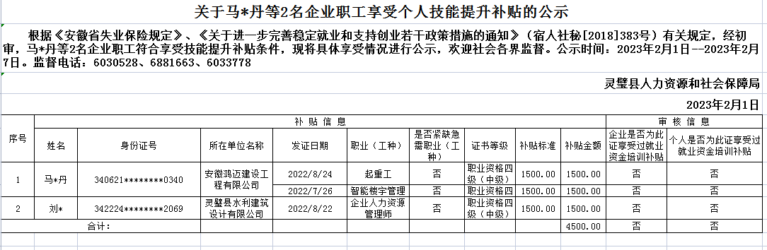 关于马*丹等2名企业职工享受个人技能提升补贴的公示