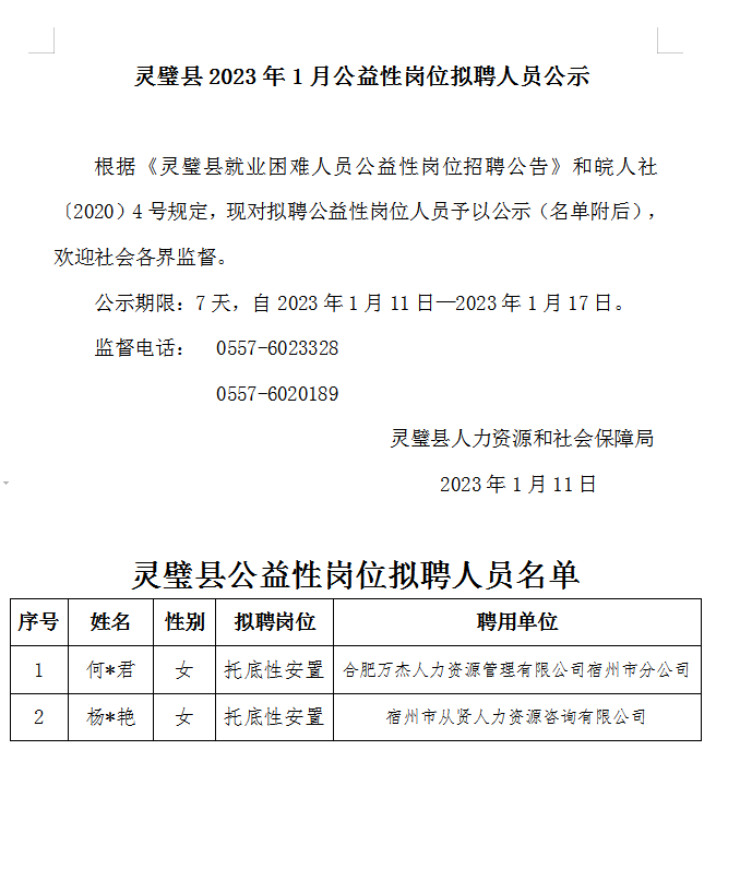 灵璧县2023年1月公益性岗位拟聘人员公示