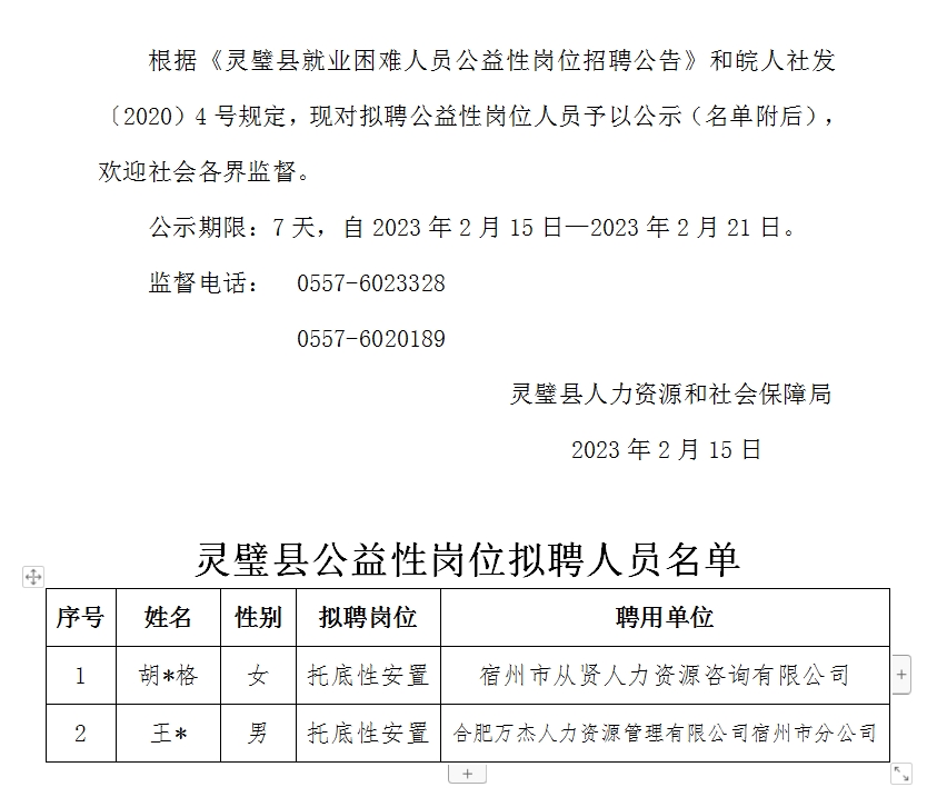 灵璧县2023年2月份公益性岗位拟聘人员公示