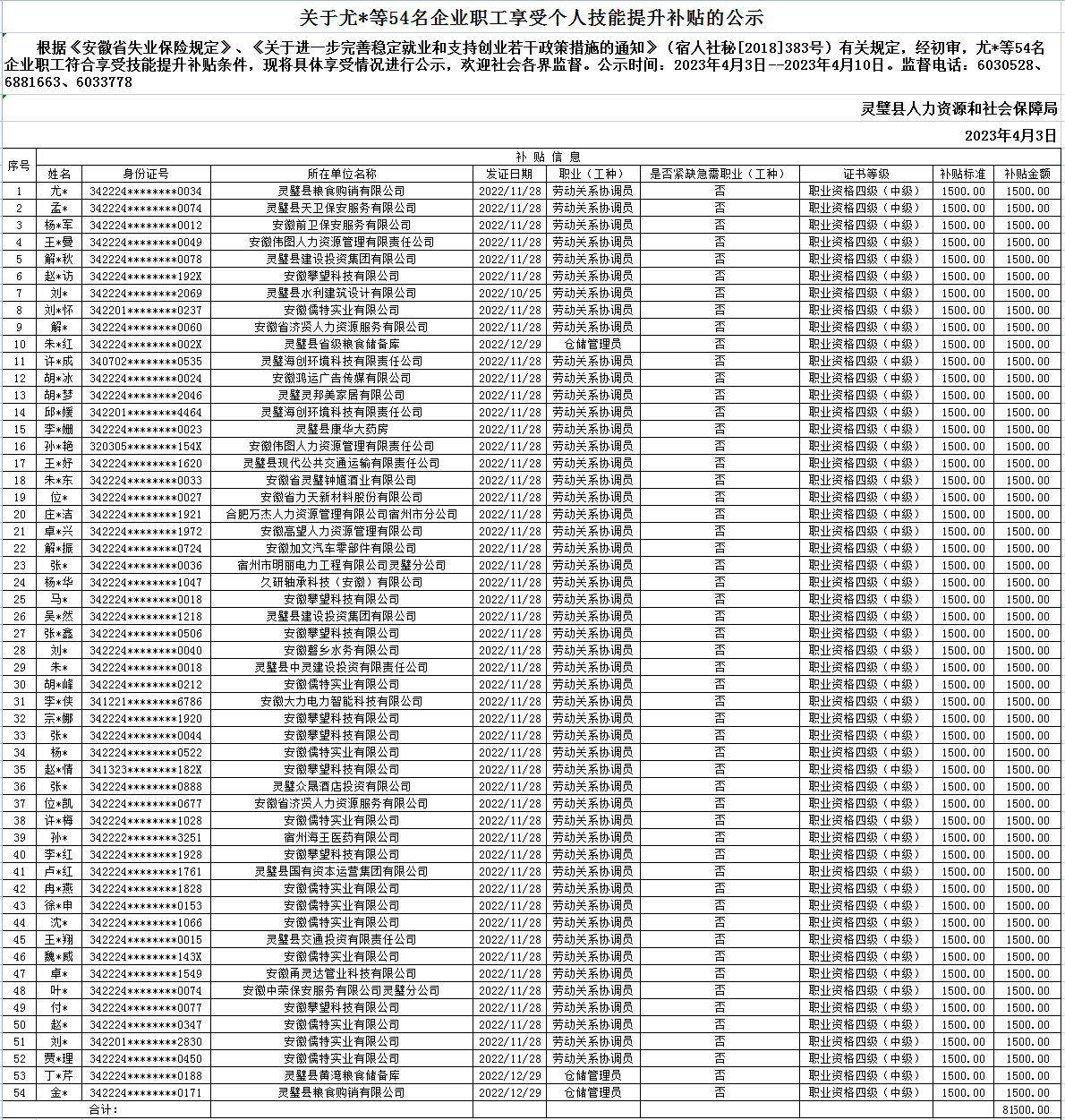 关于尤*等54名企业职工享受个人技能提升补贴的公示