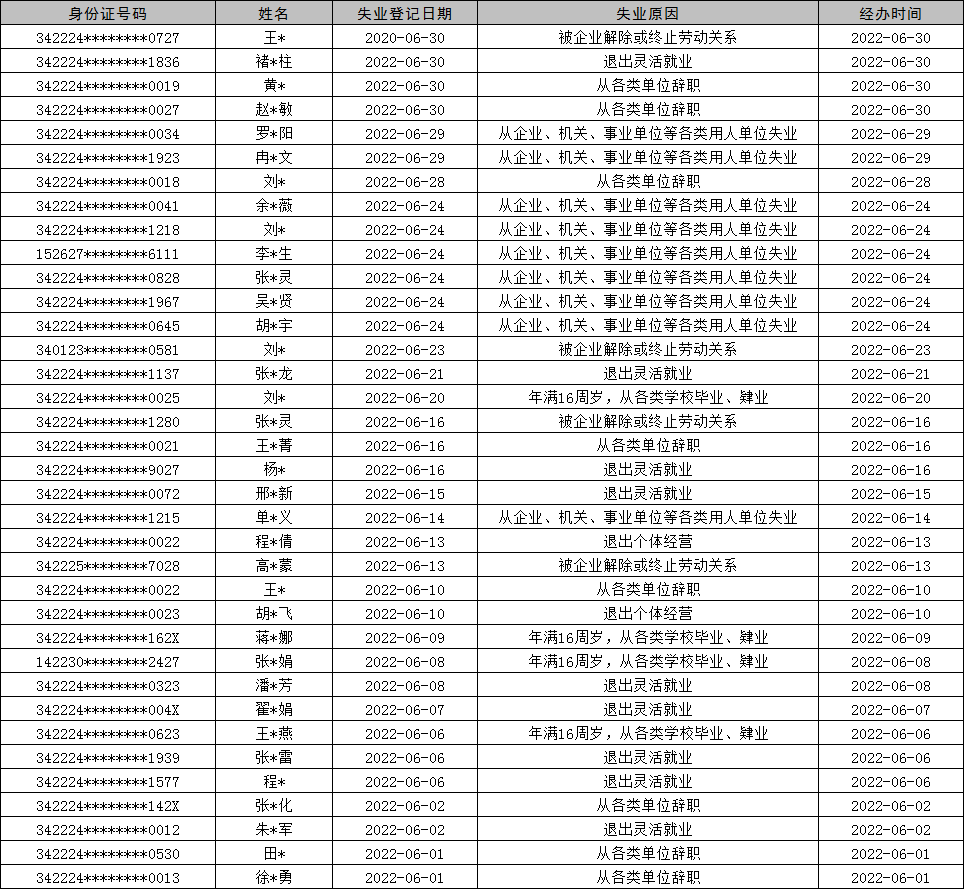 灵璧县2022年6月失业登记统计表
