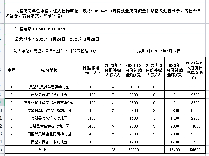 2023年2-3月份就业见习资金补贴及见习人员情况公示