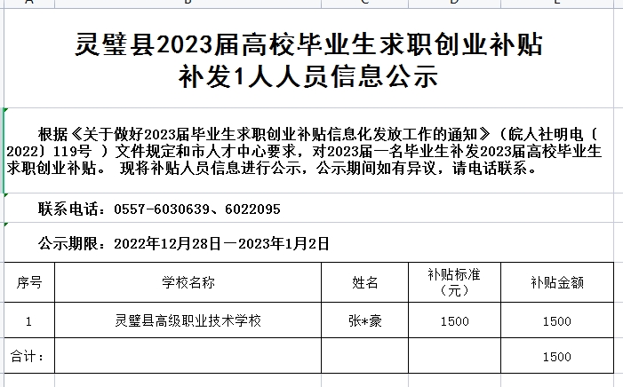 灵璧县2023届高校毕业生求职创业补贴补发1人人员信息公示