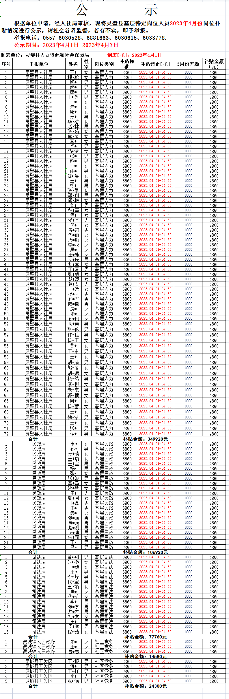 2023年4月份灵璧县基层特定岗位人员岗位补贴情况公示