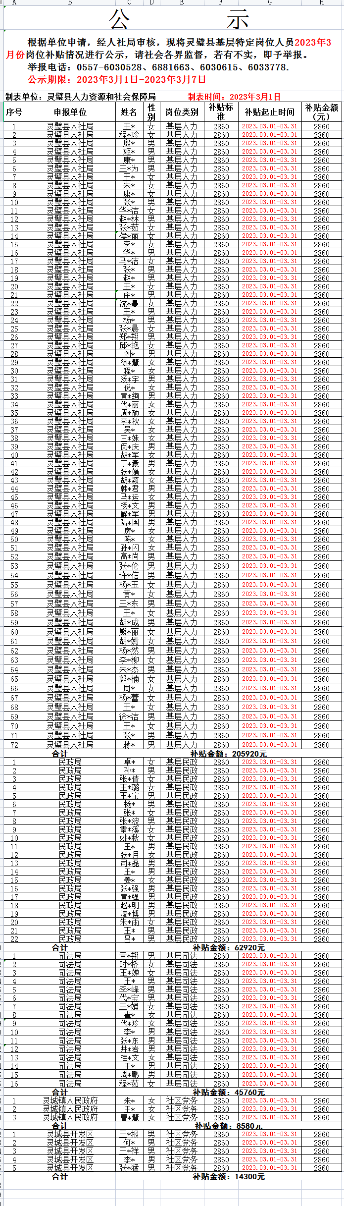 2023年3月份灵璧县基层特定岗位人员岗位补贴情况公示