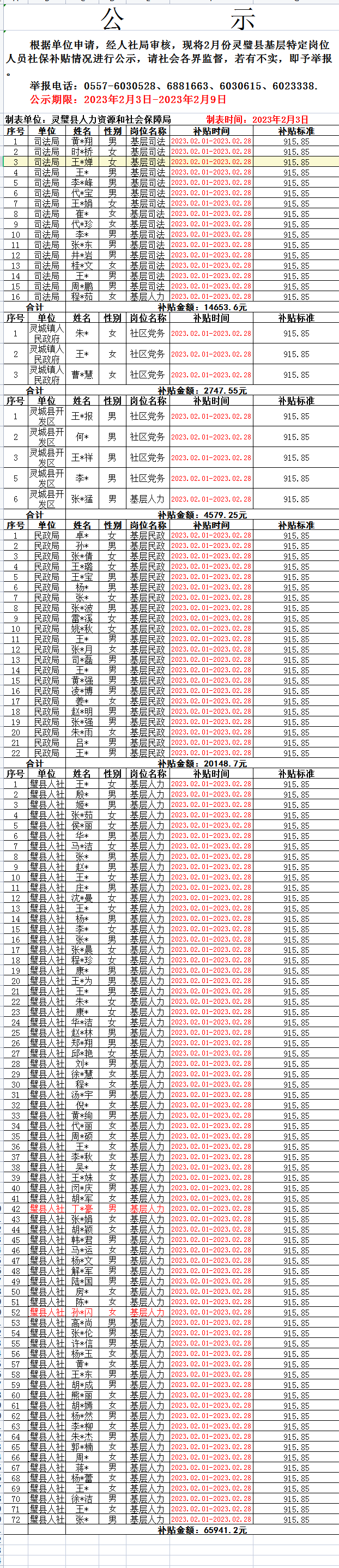 2023年2月份灵璧县基层特定岗位人员社保补贴情况公示