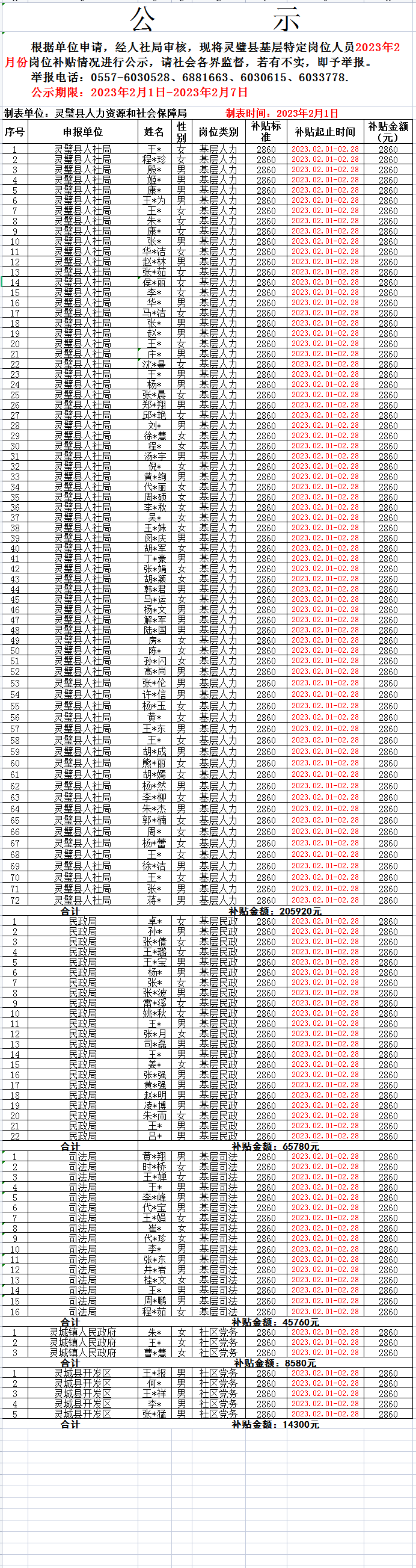 2023年2月份灵璧县基层特定岗位人员岗位补贴情况公示