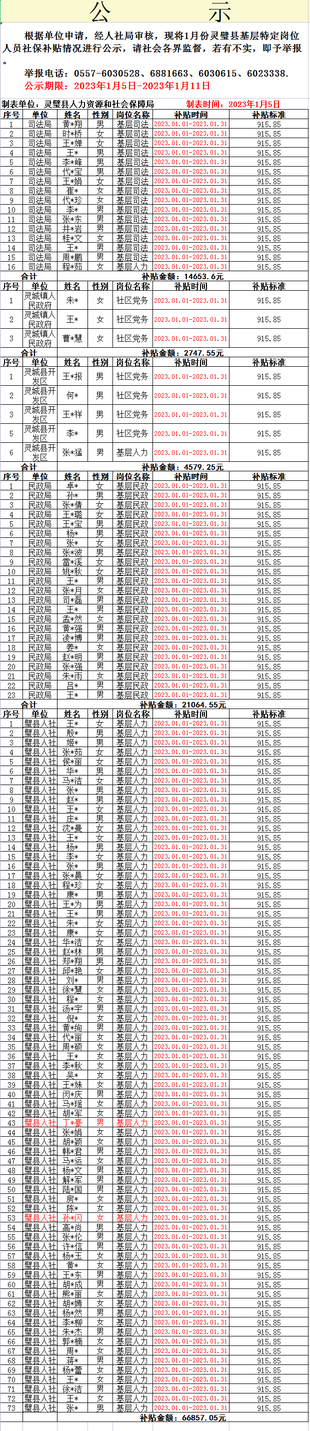 2023年1月份灵璧县基层特定岗位人员社保补贴情况公示