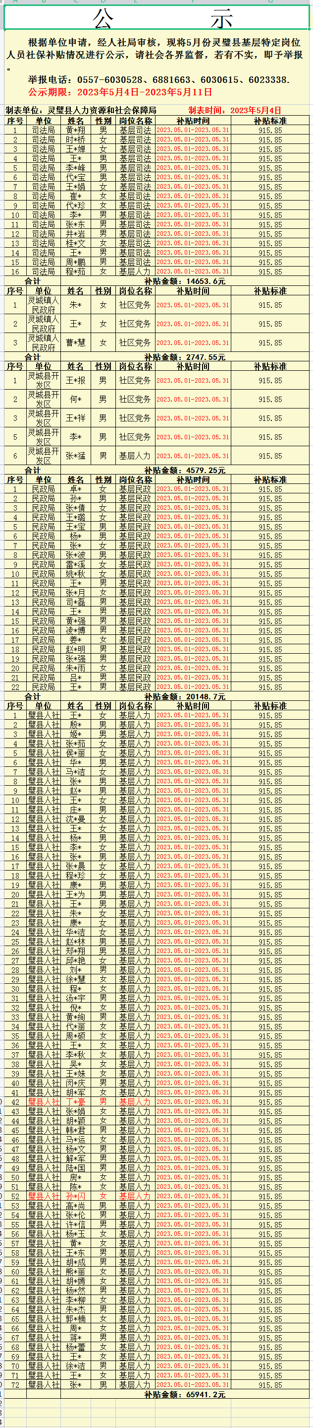 2023年5月份灵璧县基层特定岗位人员社保补贴情况公示