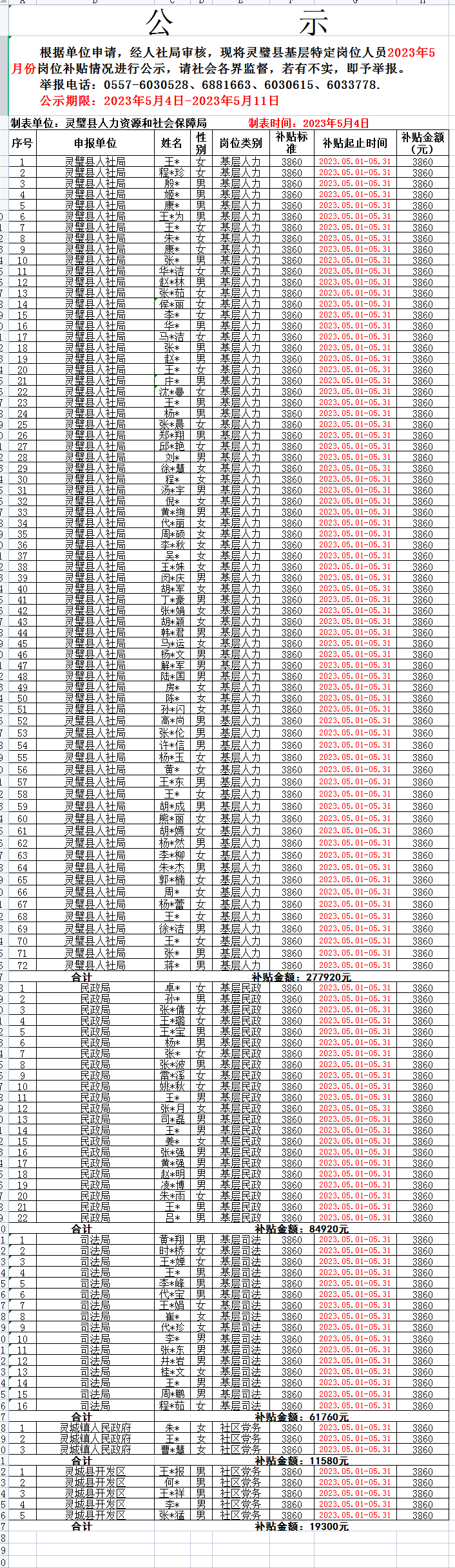 2023年5月份灵璧县基层特定岗位人员岗位补贴情况公示