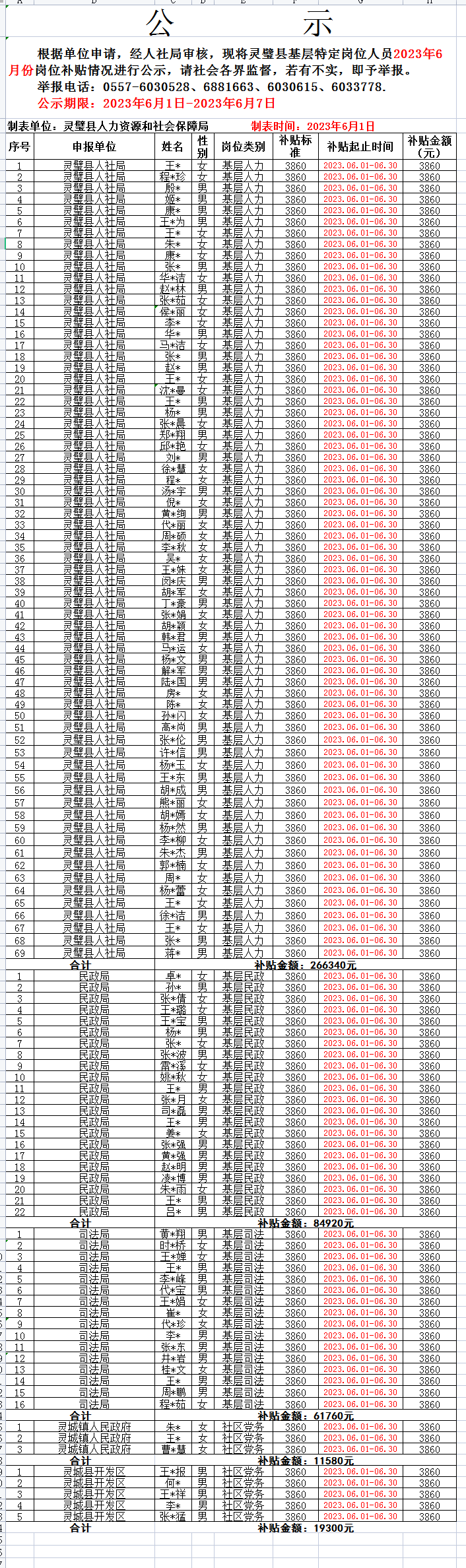 2023年6月份灵璧县基层特定岗位人员岗位补贴情况公示