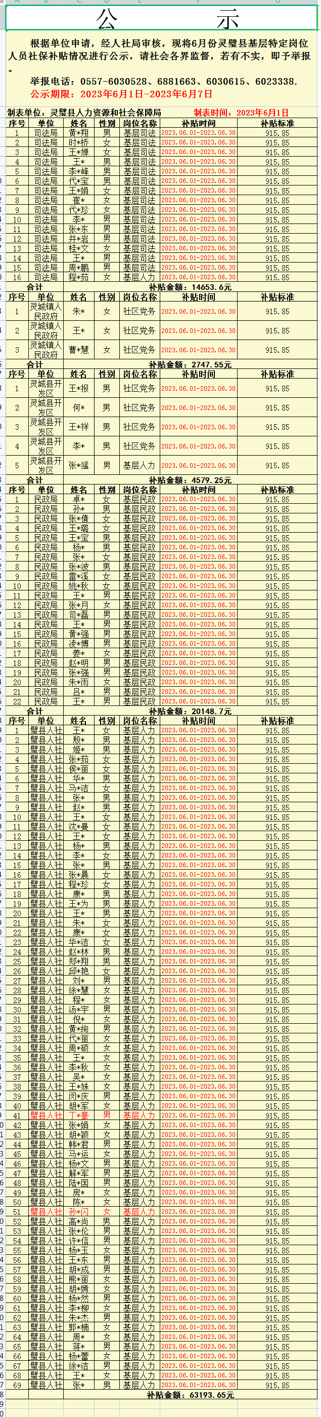 2023年6月份灵璧县基层特定岗位人员社保补贴情况公示