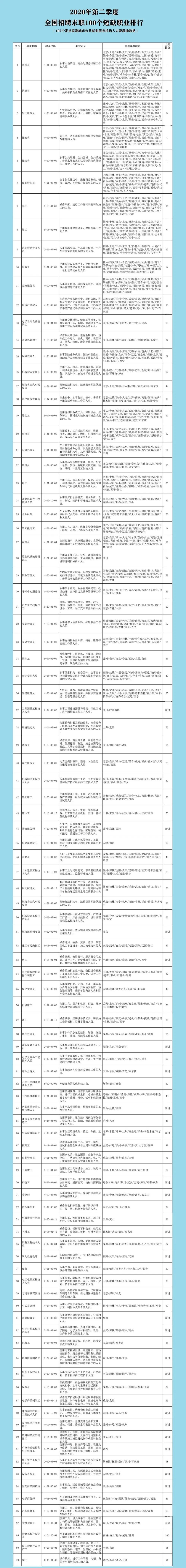 人社部7月21日公布“2020年第二季度全国招聘求职100个短缺职业排行”。今年二季度,排在短缺职业榜前几位的是营销员、快递员、餐厅服务员、保安员、保洁员、商品营业员、车工等。总体求人倍率(招聘需求人数与求职人数的比值)从一季度2.62下降到2.01,下降23.3%,市场供求关系得到明显缓解。