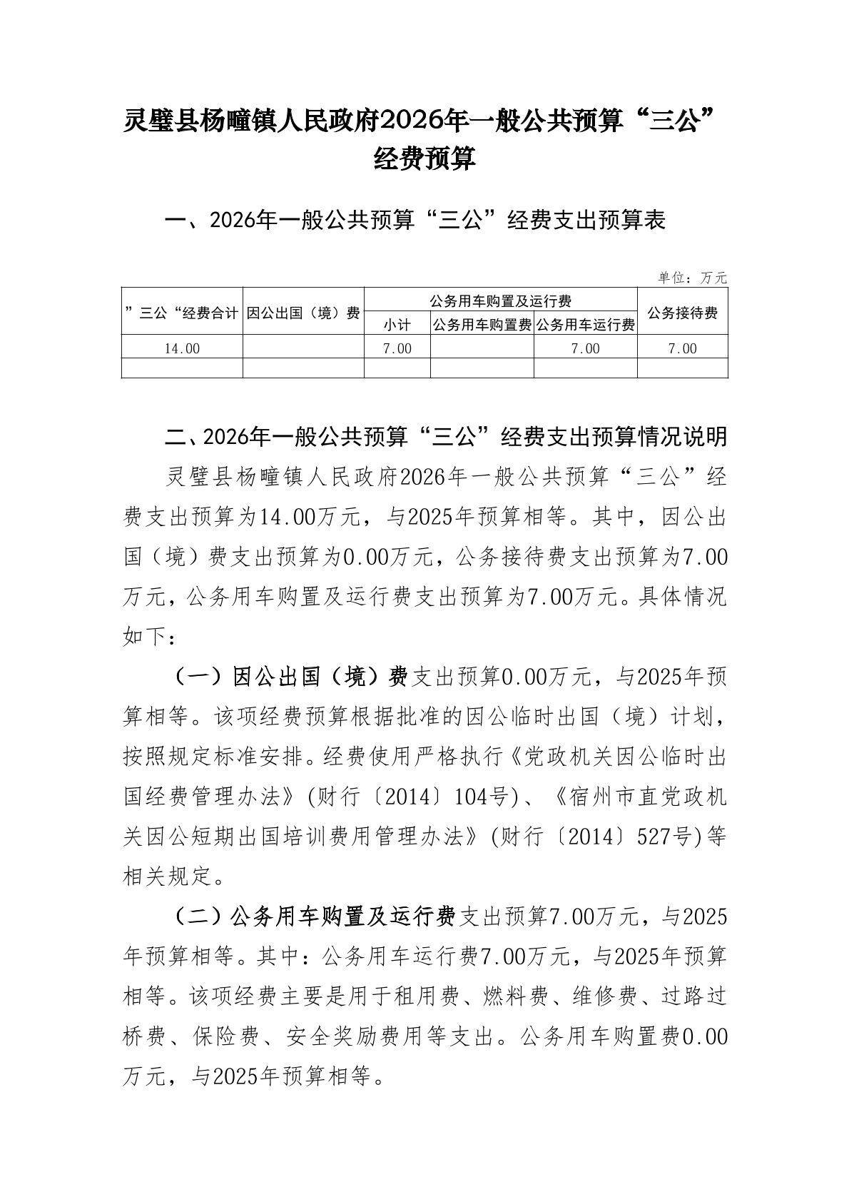 灵璧县杨疃镇人民政府2026年一般公共预算“三公”经费预算