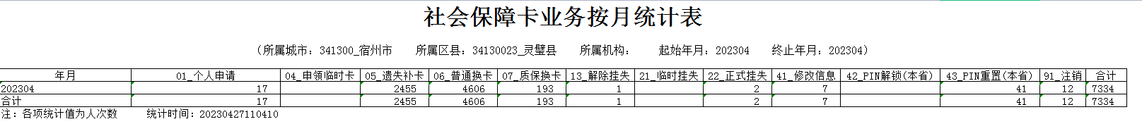 灵璧县2023年4月份社会保障卡服务管理情况统计表