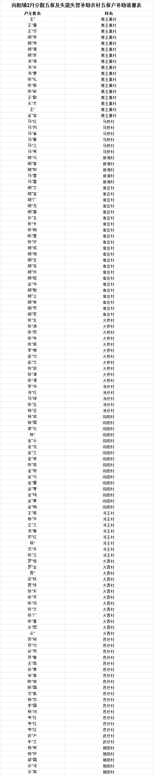 向阳镇2月分散五保及失能失智补助农村五保户补助清册表