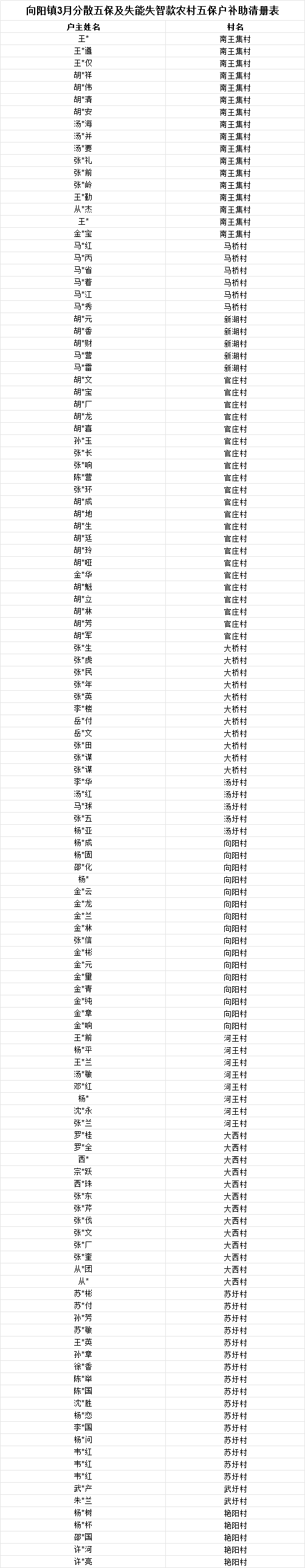 向阳镇3月分散五保及失能失智补助农村五保户补助清册表