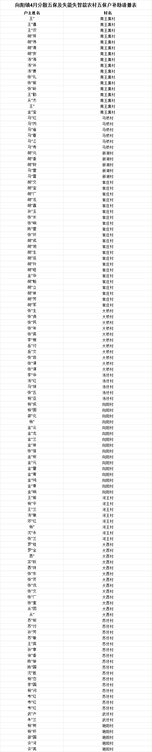 向阳镇4月分散五保及失能失智补助农村五保户补助清册表