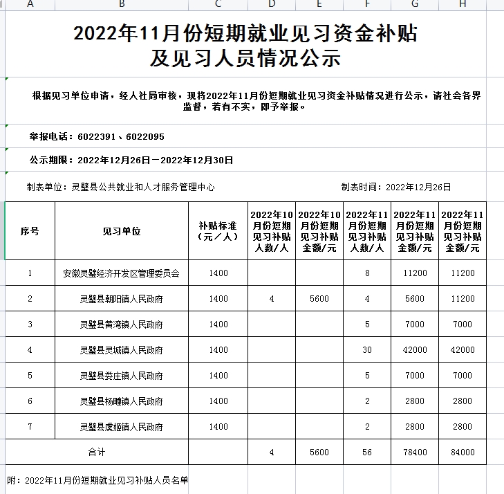 2022年11月份短期就业见习资金补贴及见习人员情况公示