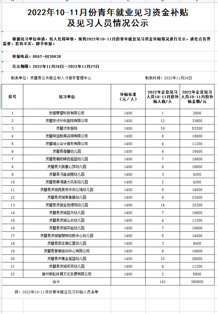 2022年10-11月份青年就业见习资金补贴及见习人员情况公示