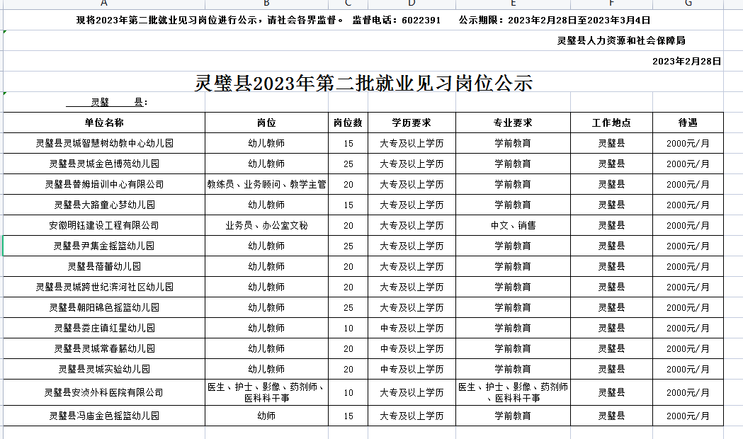 灵璧县2023年第二批就业见习岗位公示