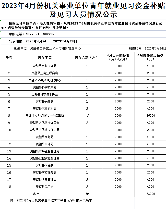 2023年4月份机关事业单位青年就业见习资金补贴及见习人员情况公示