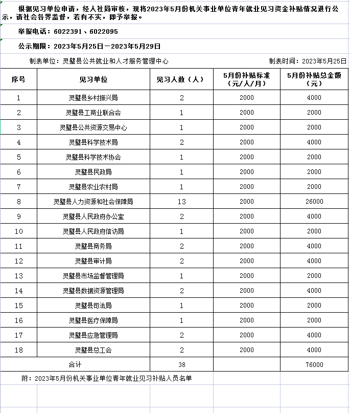 2023年5月份机关事业单位青年就业见习资金补贴及见习人员情况公示