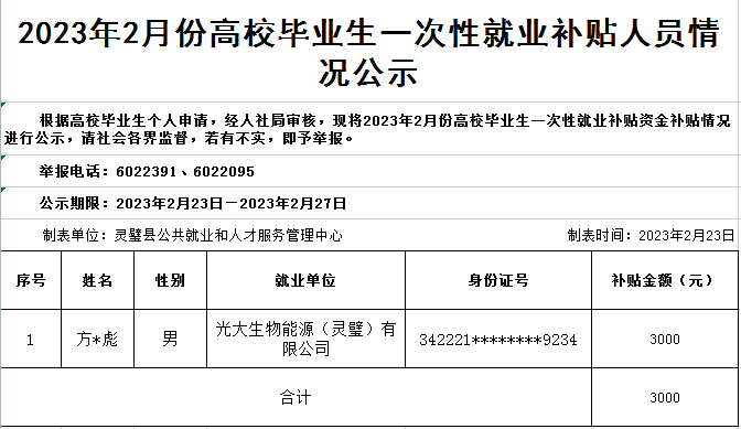 灵璧县2023年2月高校毕业生一次性就业补贴人员情况公示
