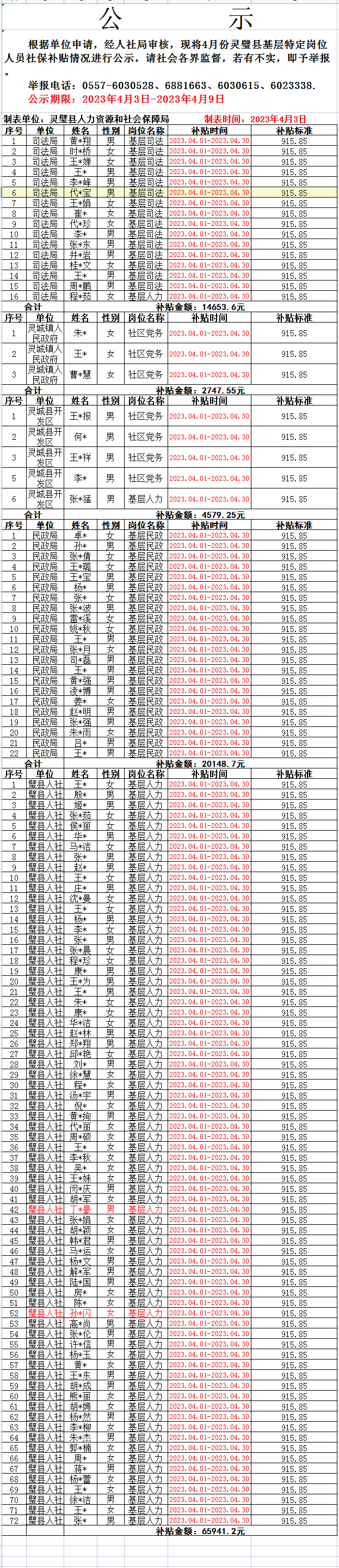 2023年4月份灵璧县基层特定岗位人员社保补贴情况公示