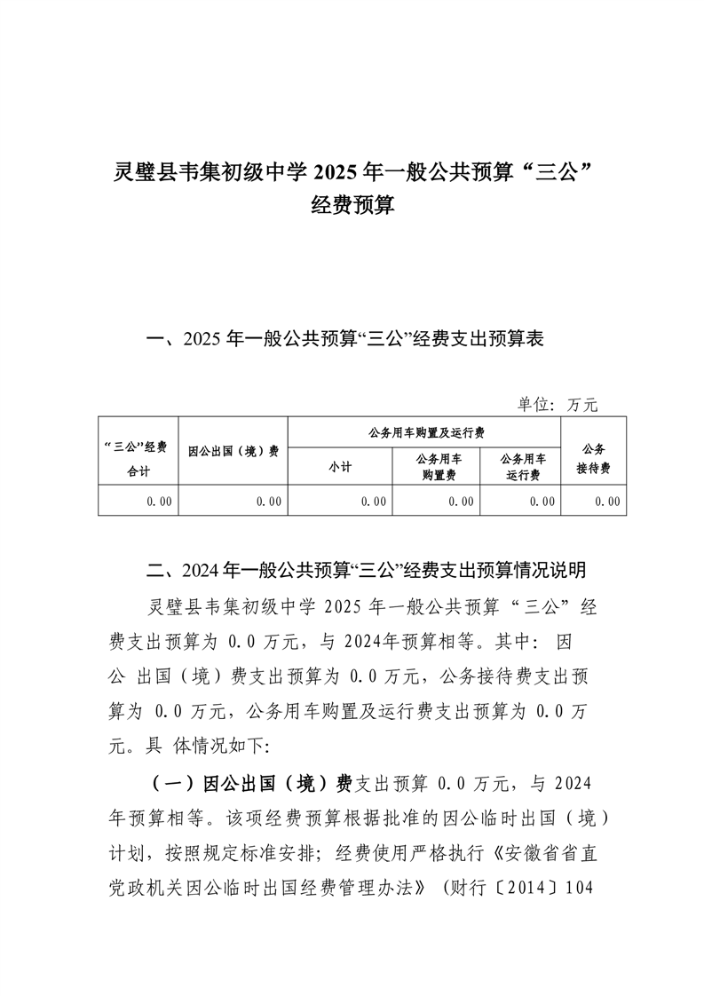 灵璧县韦集初级中学2025年一般公共预算“三公”经费预算公开