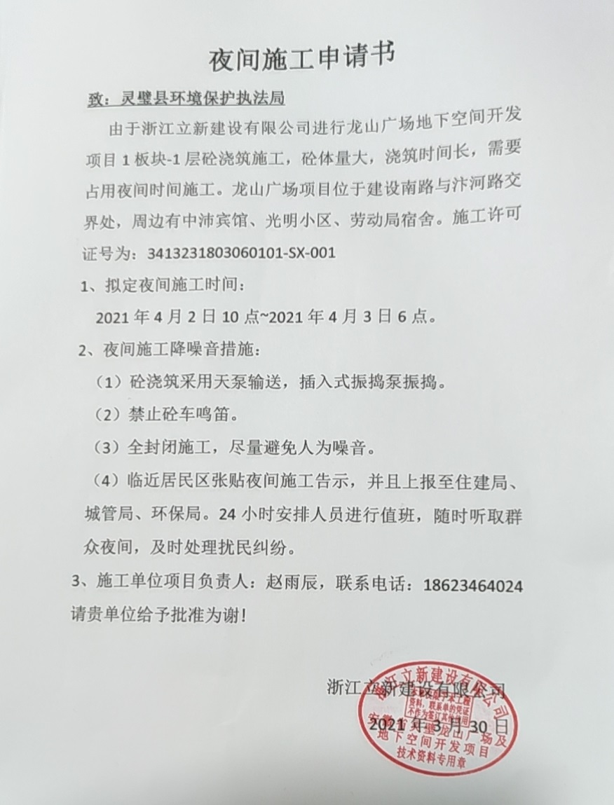 浙江立新建设有限公司龙山广场地下空间开发项目夜间施工申请