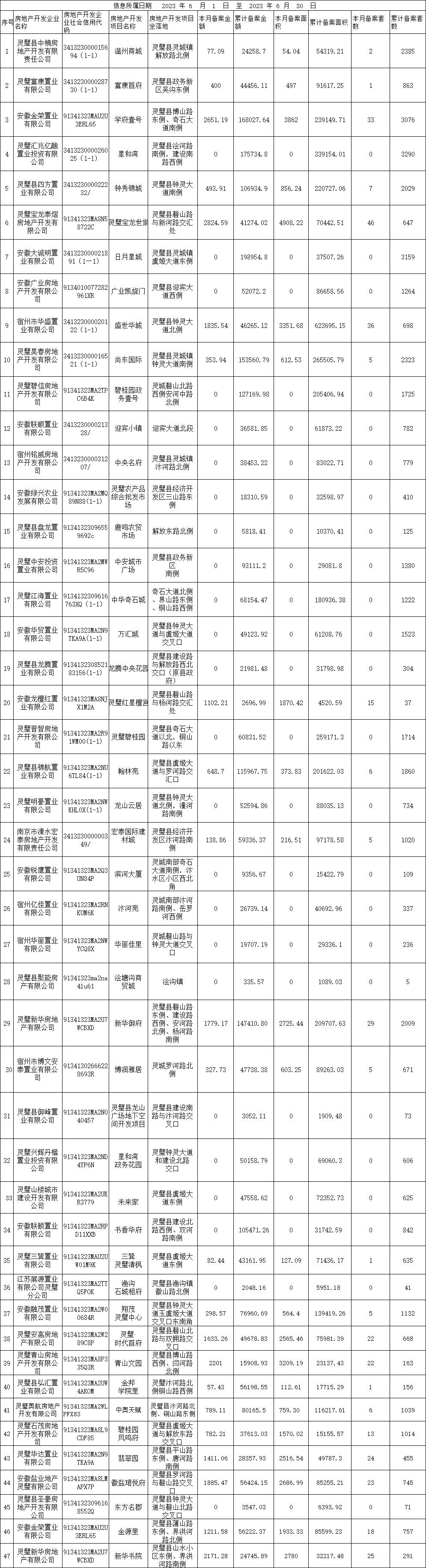 灵璧县住建局2023年6月份商品房备案信息