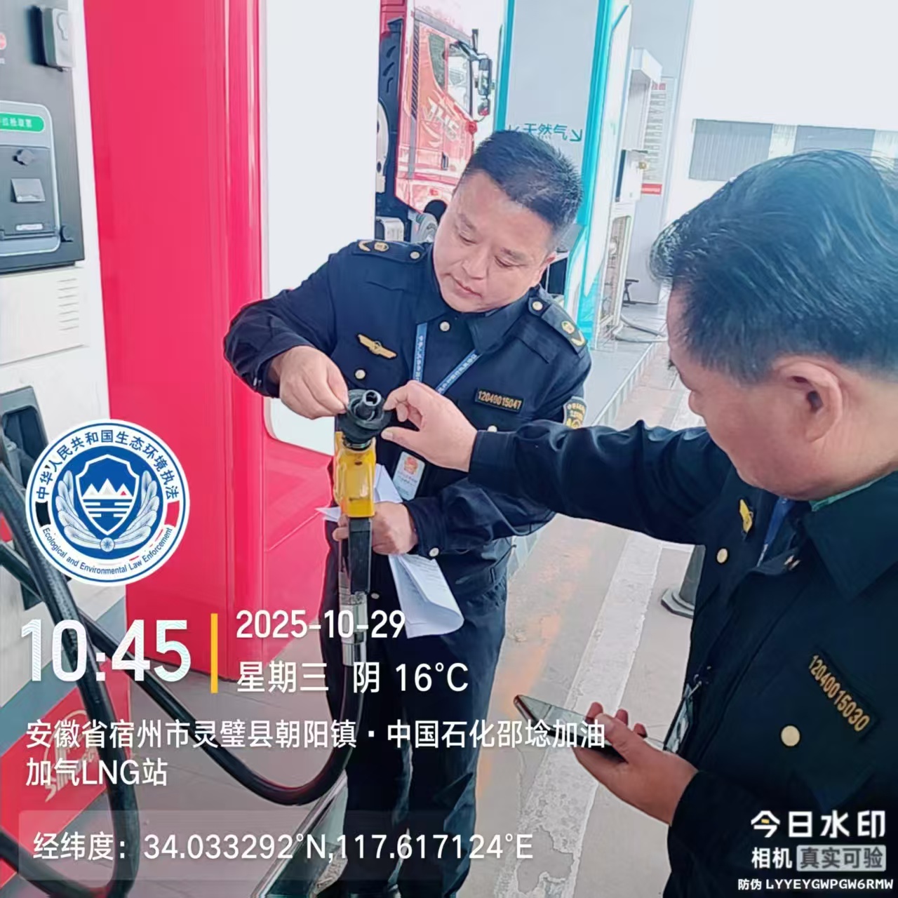 灵璧县生态环境分局对加油站开展执法检查,围绕油气回收系统运行、污染物排放控制及台账管理等方面展开。