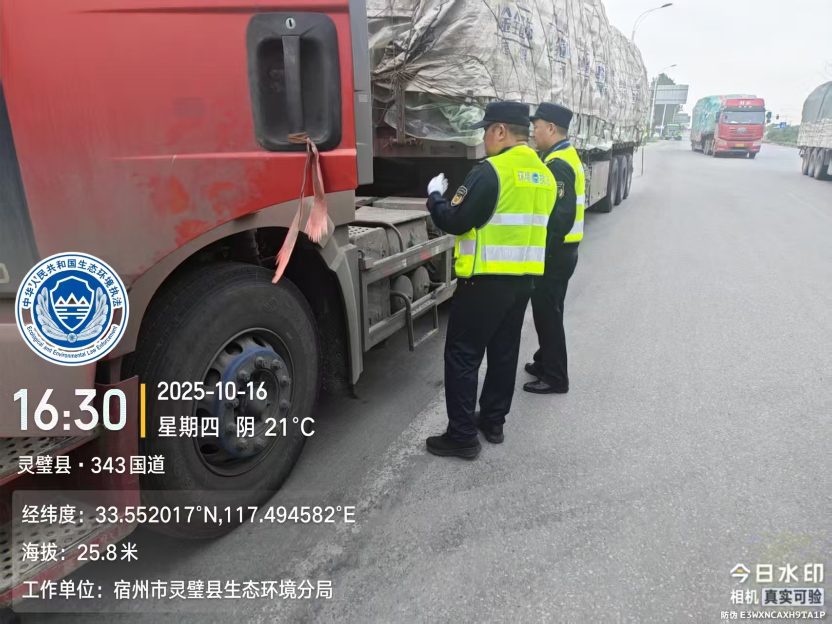 灵璧县生态环境分局在重点路段对重型柴油货车开展执法检查,检查其是否存在尾气超标排放及环保装置违规使用等问题。