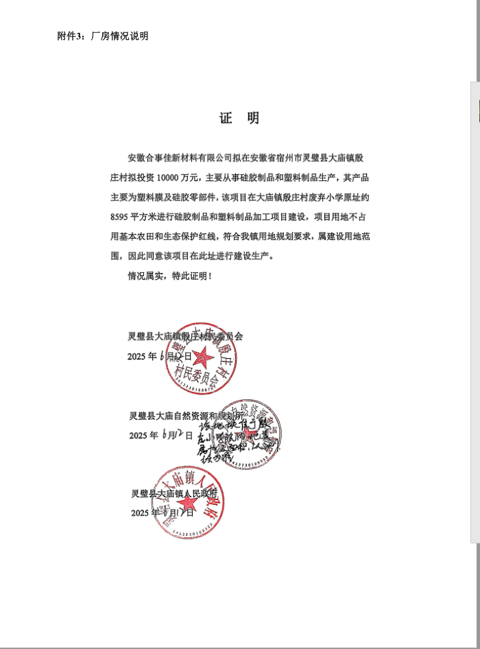 拟投资1000万元,租赁大庙镇标准化厂房占地约13亩,共3栋1F生产厂房,其中橡胶制品生产线单独在1栋厂房,塑料膜加工分别在两栋各设1条产线,配置开炼机、挤塑机、切条机、热压机、喷砂系统等生产装备,同时配套办公生活、消防、安全、环保等辅助设施,项目建设完成后可形成年产硅胶零部件500吨、塑料膜材料2000吨的生产规模。 |