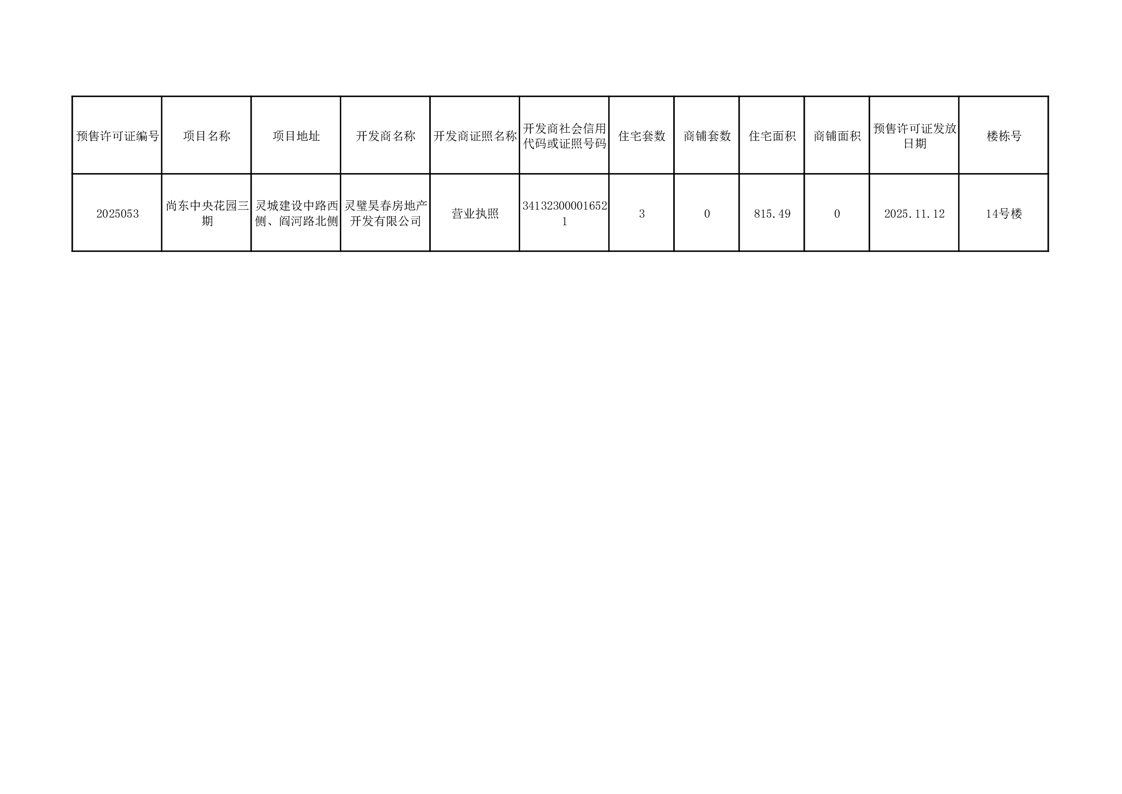 灵璧县住建局2025年11月商品房预售许可证统计表