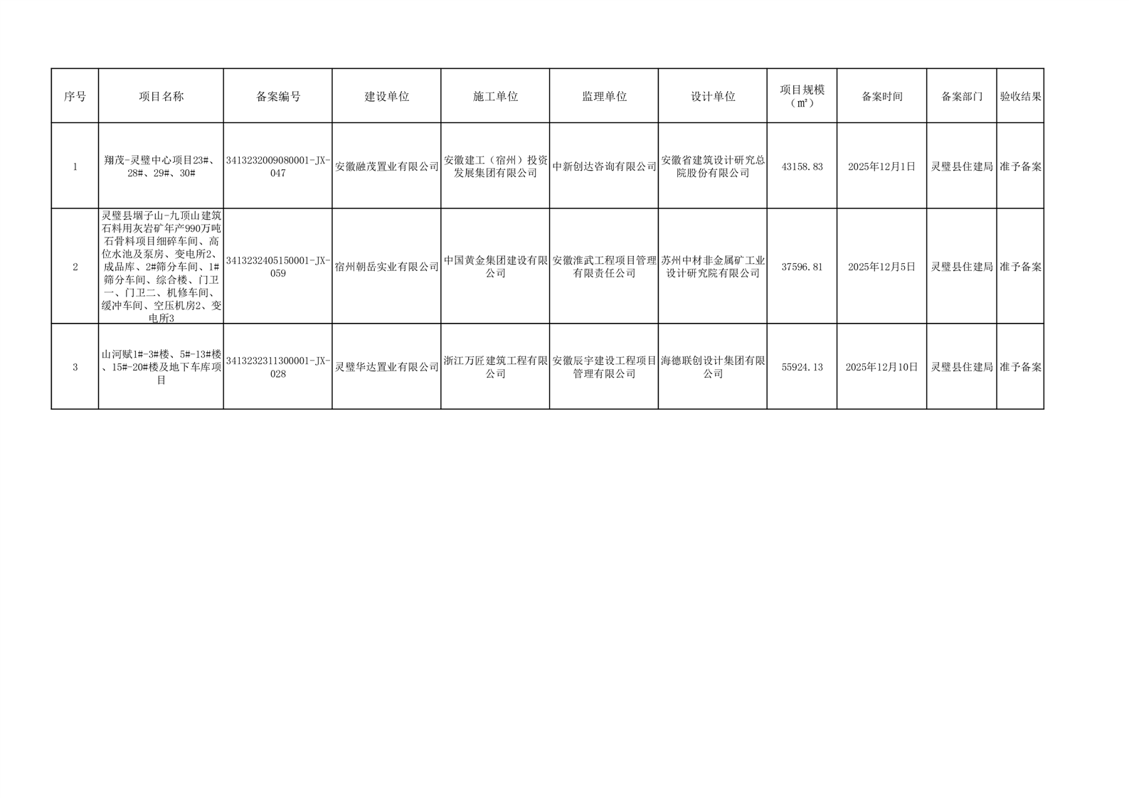 灵璧县住建局2025年12月份竣工备案信息