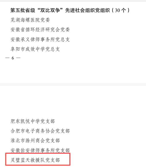 近日,中共安徽省委组织部、中共安徽省委社会工作部、中共安徽省委非公有制经济和社会组织工作委员会印发《关于命名第十批省级“双强六好”非公企业党组织、第五批省级“双比双争”先进社会组织党组织的通知》,命名灵璧蓝天救援队党支部为省级“双比双争”先进社会组织党组织。这一殊荣是对灵璧蓝天救援队党支部扎实工作和突出成效的高度认可,更是全体党员践行初心、担当作为与全体队员恪尽职守、英勇拼搏的直接体现。