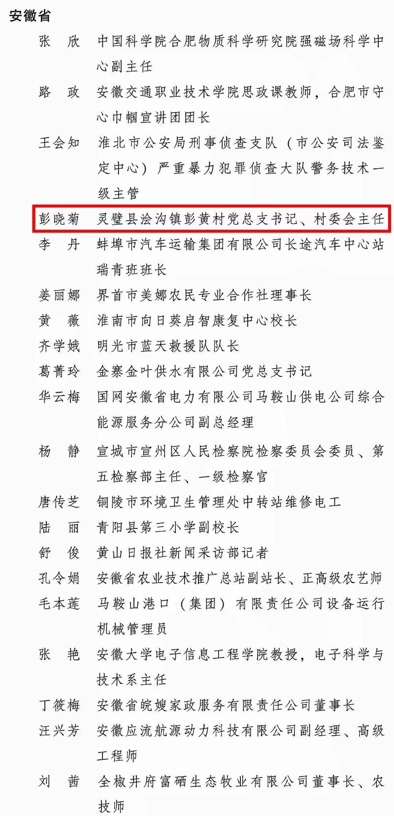 其中,灵璧县浍沟镇彭黄村党总支书记、村委会主任 彭晓菊,被授予全国三八红旗手称号。