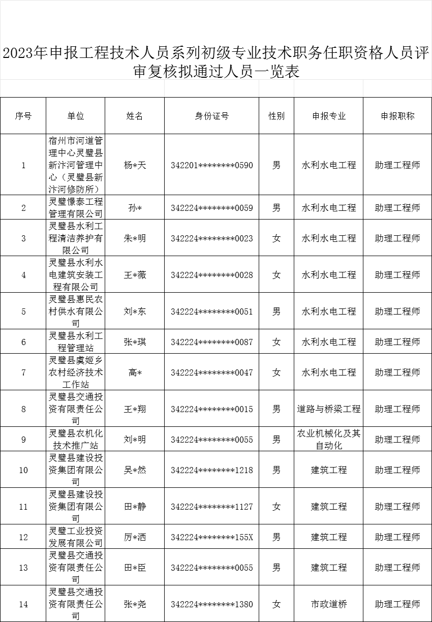 根据宿州市人社局《关于做好2023年度全市职称评审工作的通知》(宿职评〔2023〕1号)文件,经评审、公示,现将2023年度灵璧县申报工程系列初级专业技术资格评审复核拟通过14人予以公示(名单见附件),公示时间5个工作日。