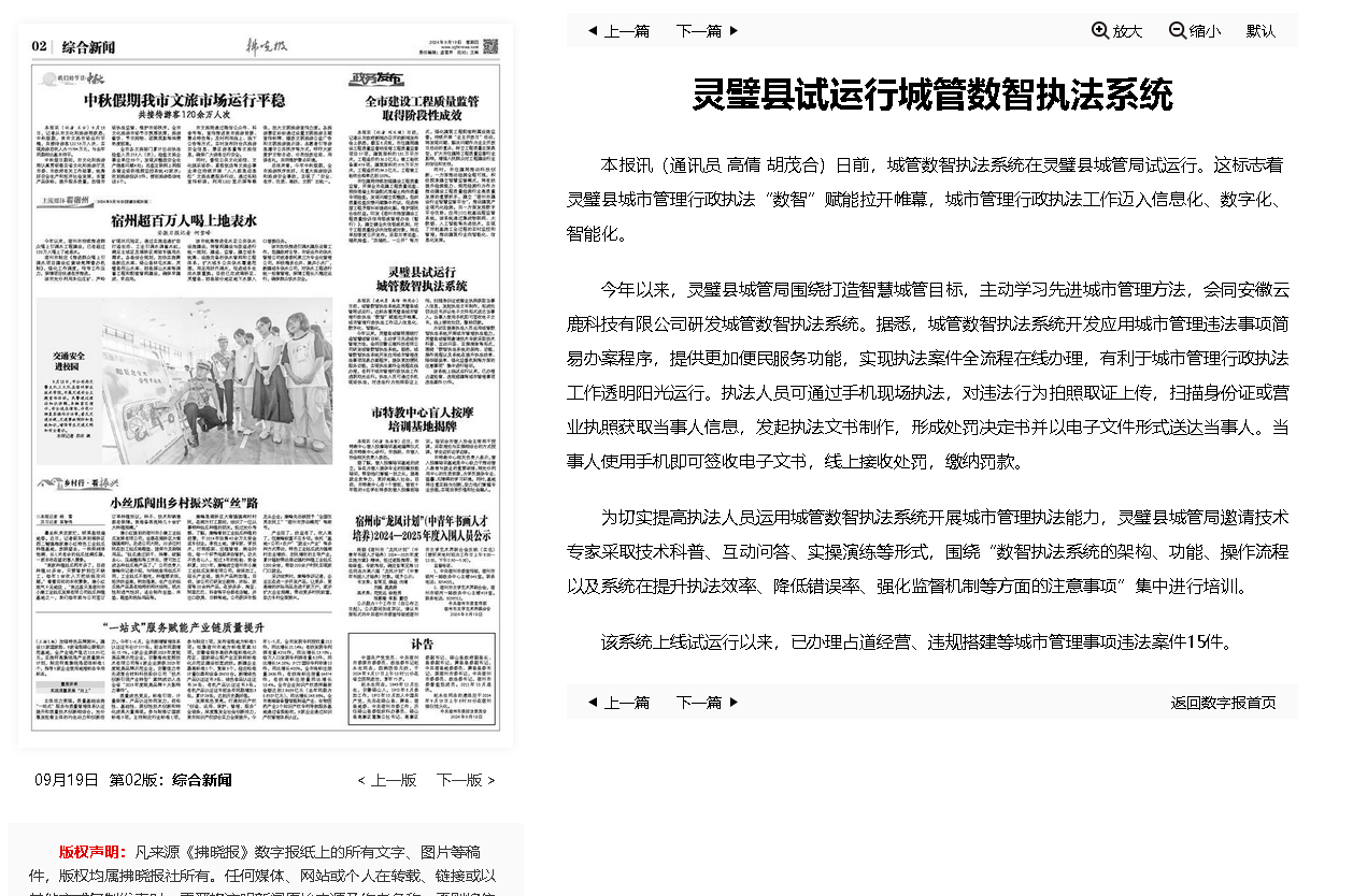今年以来,灵璧县城管局围绕打造智慧城管目标,主动学习先进城市管理方法,会同安徽云鹿科技有限公司研发城管数智执法系统。据悉,城管数智执法系统开发应用城市管理违法事项简易办案程序,提供更加便民服务功能,实现执法案件全流程在线办理,有利于城市管理行政执法工作透明阳光运行。执法人员可通过手机现场执法,对违法行为拍照取证上传,扫描身份证或营业执照获取当事人信息,发起执法文书制作,形成处罚决定书并以电子文件形式送达当事人。当事人使用手机即可签收电子文书,线上接收处罚,缴纳罚款。