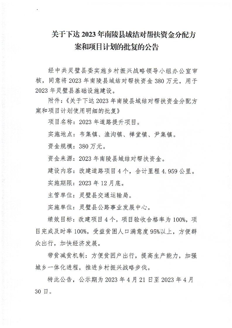 关于下达2023年南陵县域结对帮扶资金分配方案和项目计划的批复的公告