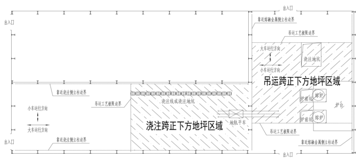 注:“正下方地坪区域”是指横向以吊运跨两侧立柱靠近熔融金属吊运侧的立柱边线为界,纵向以吊运跨最两端的铁水、钢水、液渣吊运工艺极限边界为界的车间地坪区域(图4-2)。